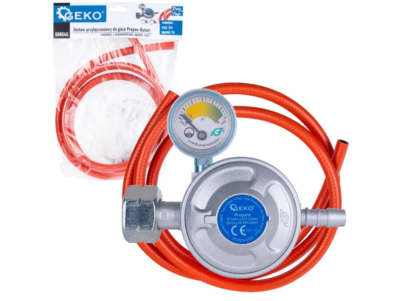 Комплект для подключения газа пропан-бутан – регулятор с манометром, шланг 2м GEKO G80545